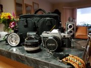 Two collector's cameras. 1. Canon AE1 (metal casing) c/w 3 lenses,carrying case and extras. $200 2. Richoflex w/case (120) $100 Open to offers