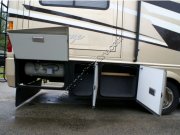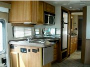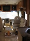 Well-designed cab has swivel chairs, rear-view camera w/ audio, pull-out desk for passenger, dual fans. Two slides. Day/night shades, tinted windows. Living area has sofa bed, lots of cabinets, lounger, fold-up desk, skylight, bench-style dinette (turns into bed). Bedroom has skylight, walk-around queen bed w/ nightstands, storage under bed, cedar-lined wardrobe. Kitchen has lots of cabinets & drawers, 2 pantries, double sink, 3-burner stove, convection microwave, stone countertops. Bathroom has residential sink & vanity, medicine cabinets, lots of drawers, separate shower, private toilet w/ skylight & linen cupboard.