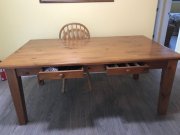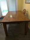 SOLID PINE HERITAGE DINING TABLE WITH 5 CHAIRS THIS IS A STURDY WELL BUILT TABLE LENGTH 72" WIDTH 42" HEIGHT 30" THIS TABLE HAS A DISTRESSED LOOK AND WITH SEAT 6 PEOPLE VERY COMFORTABLY. REPLACEMENT COST $2500.